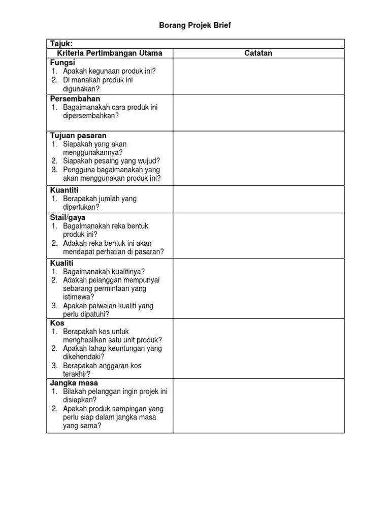 Merujuk kepada produk yang ingin dihasilkan. Terms in this set (10) · projek brief. Ciri projek brief 3.1.3 merancang projek brief untuk penghasilan produk yang kreatif. Menghasilkan produk yang menepati sasaran pengguna. Pengurus dan pereka bentuk mendapatkan maklumat daripada .